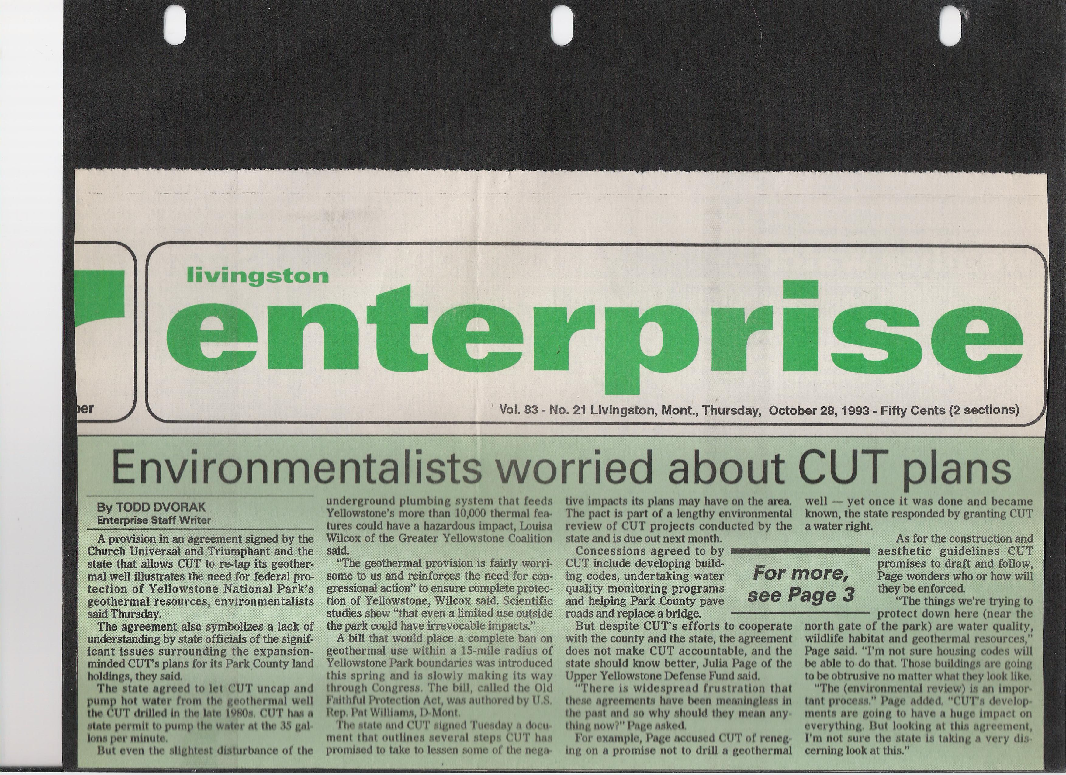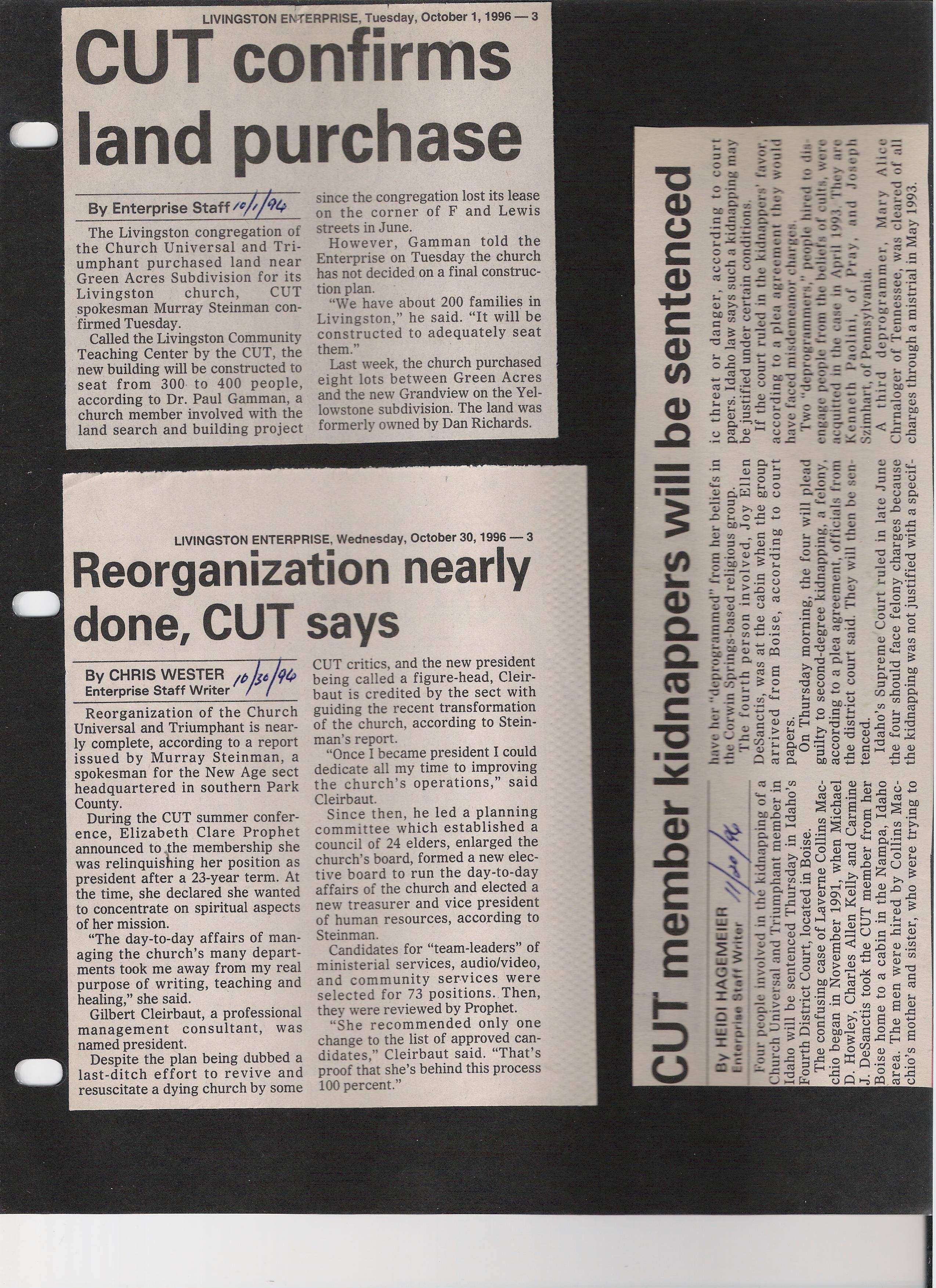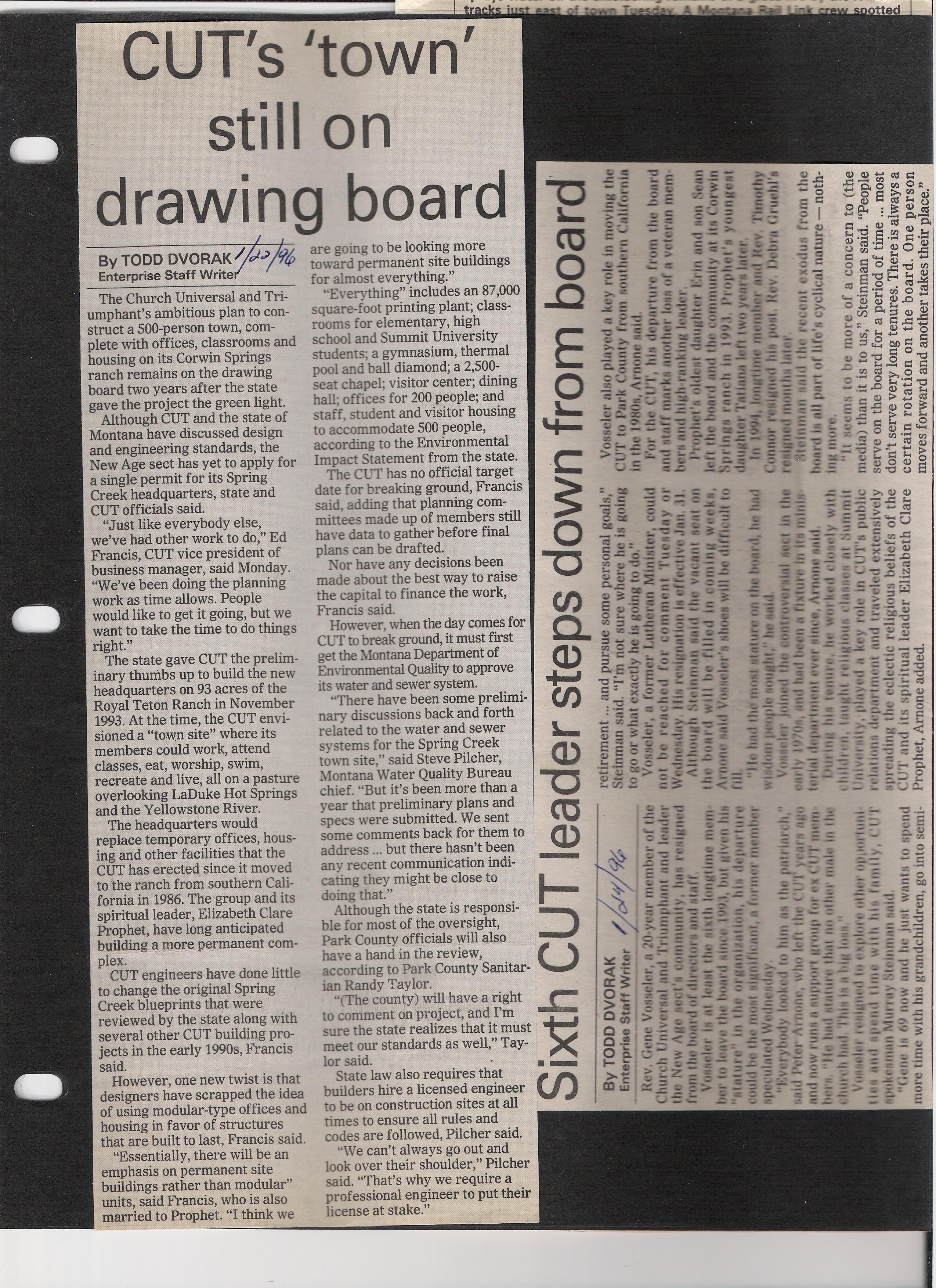 The following set of images are scans of newspaper articles related to the Church Universal and Triumphant. These articles were collected and assembled by Peter Arnone between 1992 and 1998. The primary sources are the Livingston Enterprise and the Bozeman Chronicle. There are also occasional articles from other papers, usually after the Church was involved in something that made the news on a national level.