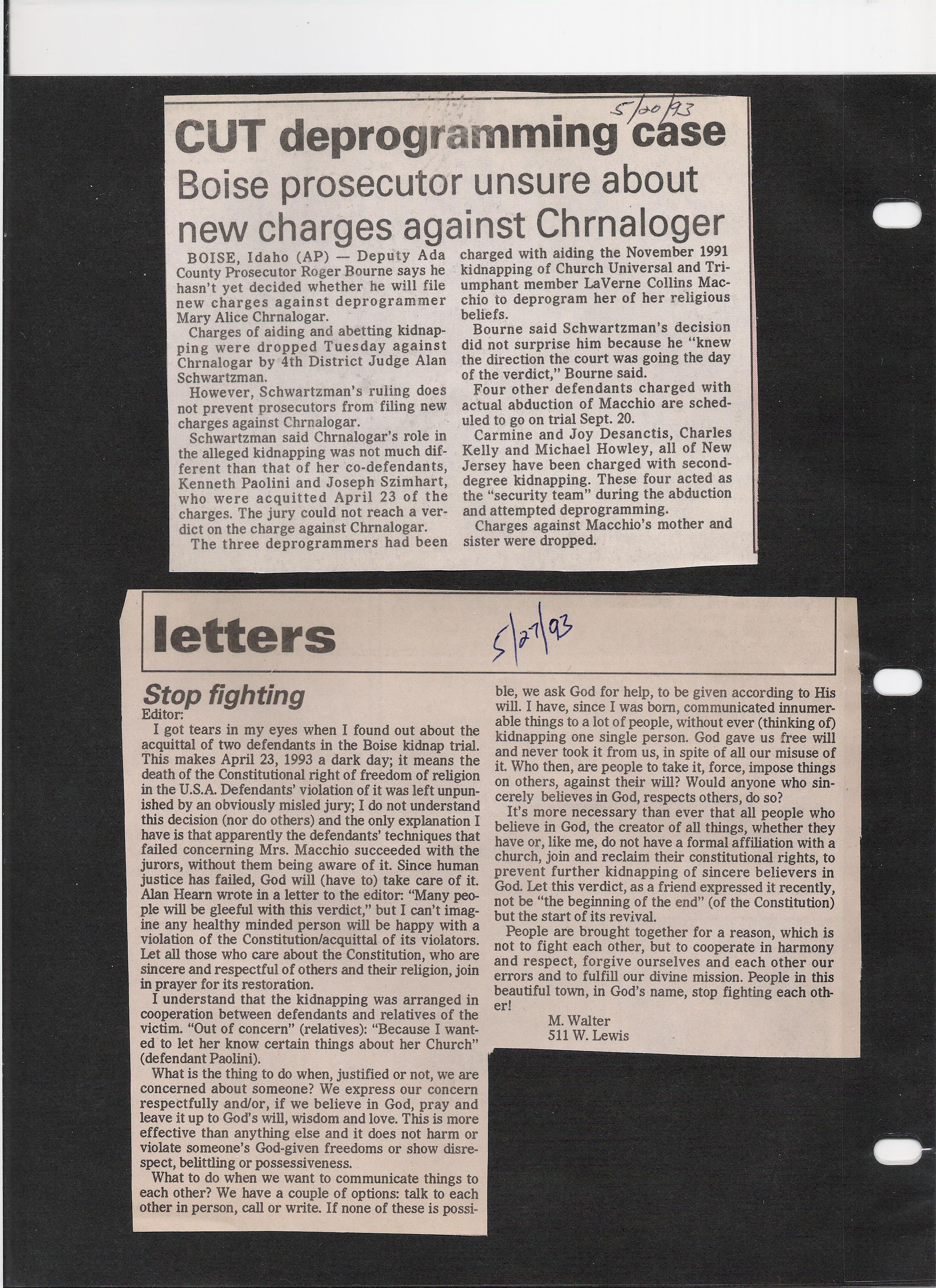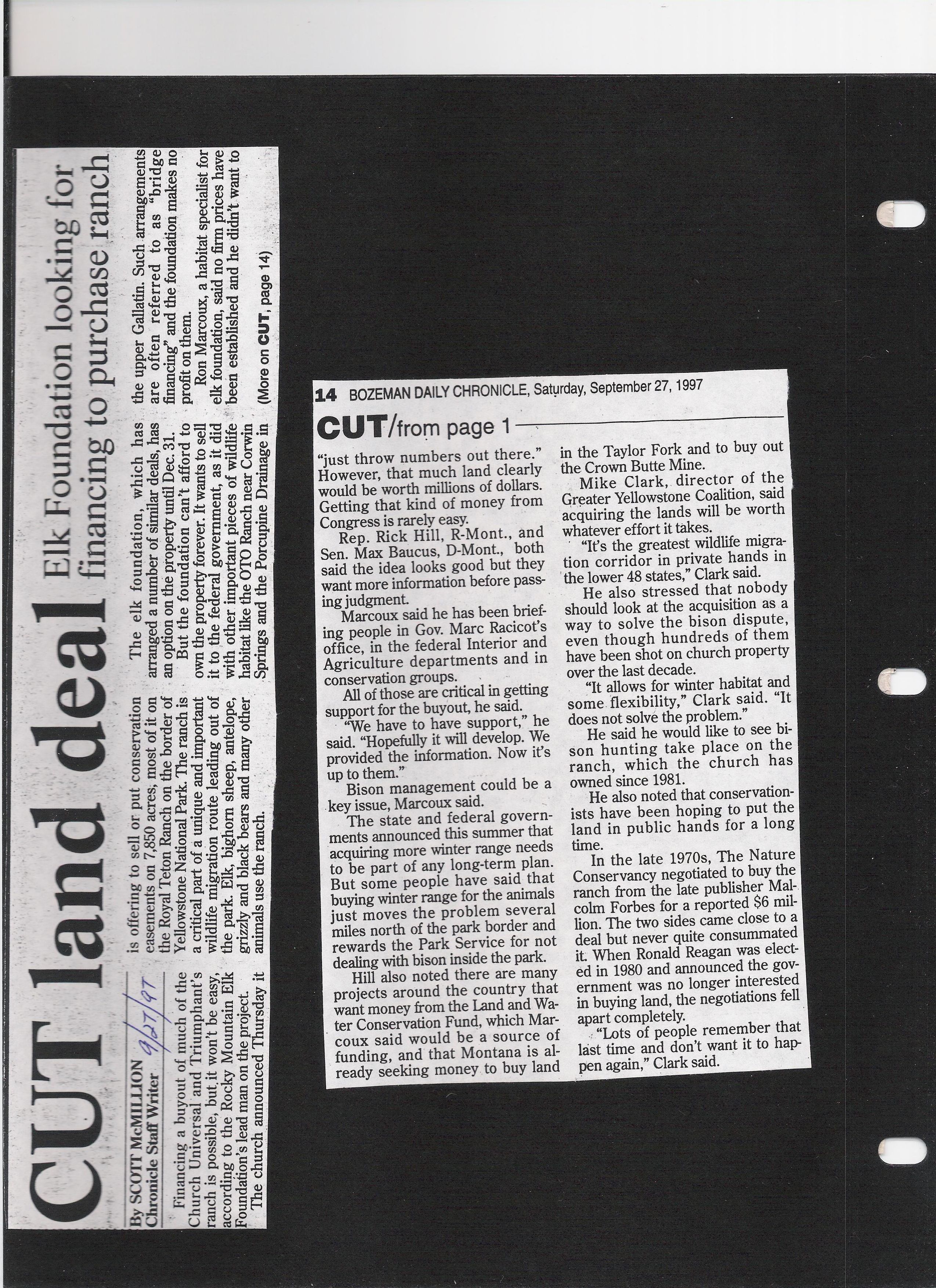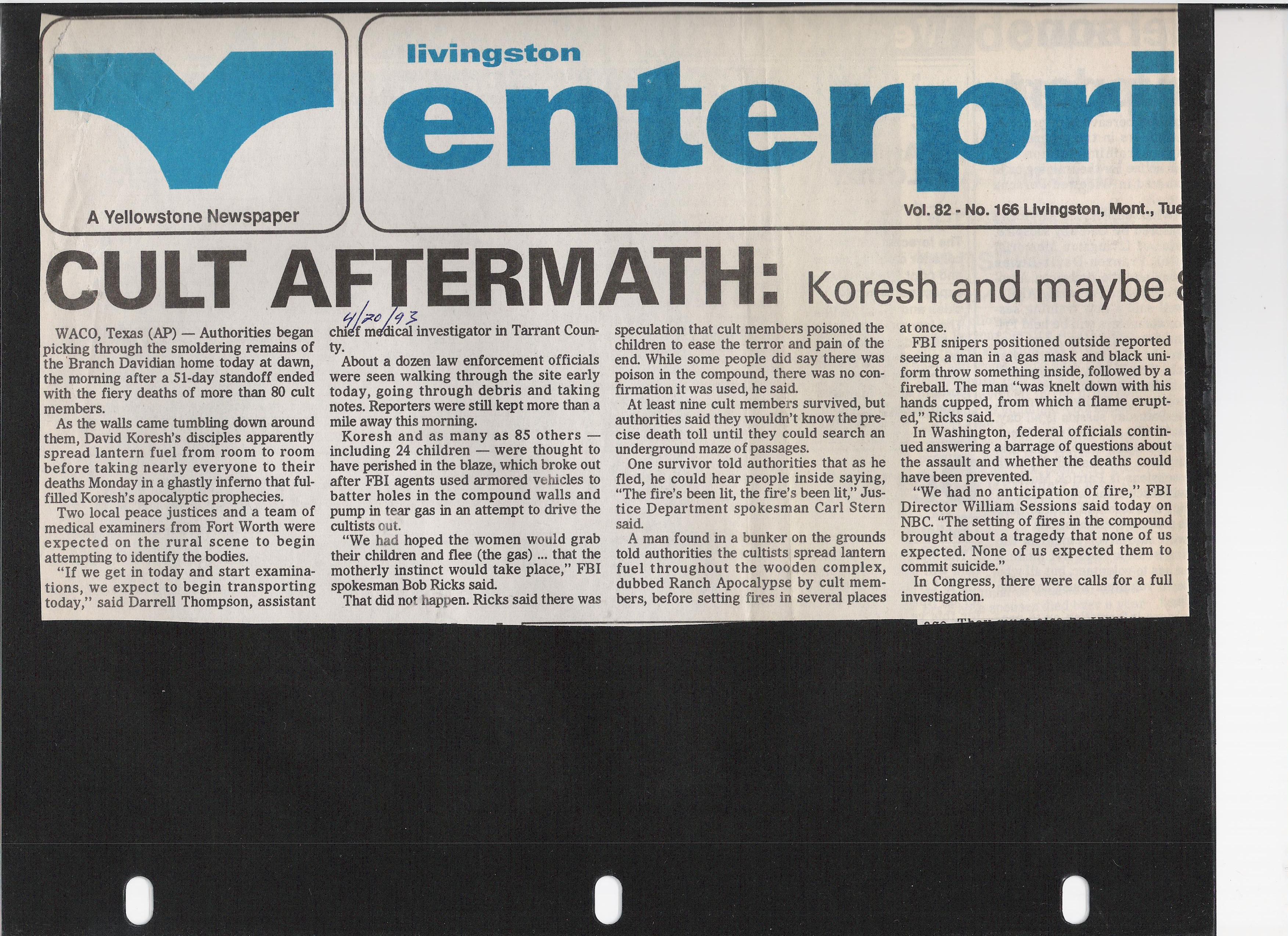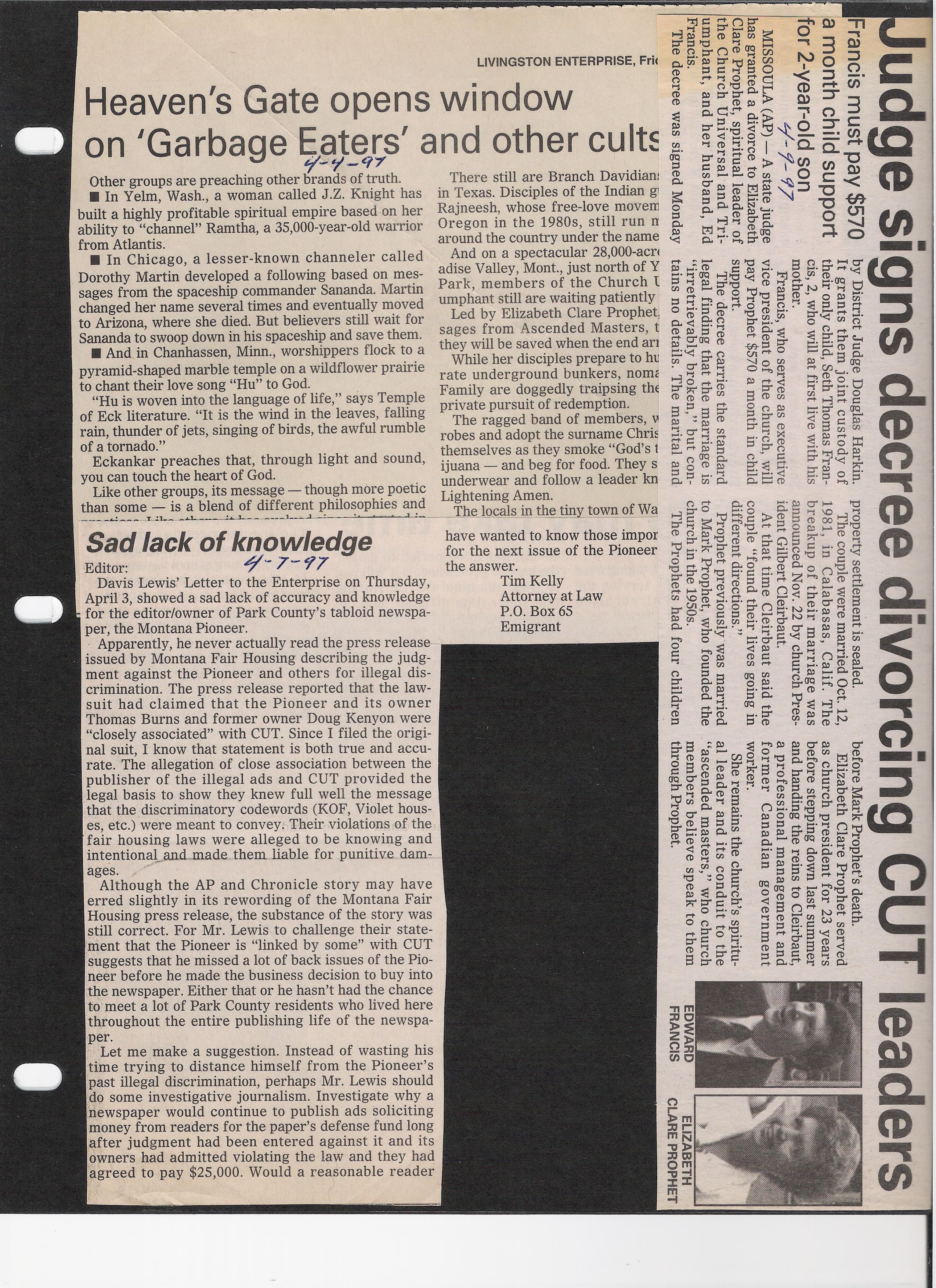 The following set of images are scans of newspaper articles related to the Church Universal and Triumphant. These articles were collected and assembled by Peter Arnone between 1992 and 1998. The primary sources are the Livingston Enterprise and the Bozeman Chronicle. There are also occasional articles from other papers, usually after the Church was involved in something that made the news on a national level.